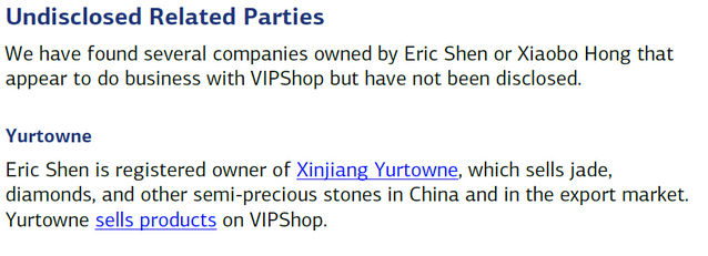 J CAP稱,董事長兼CEO沈亞、副董事長兼COO洪曉波至少持有三家公司與唯品會(huì)產(chǎn)生聯(lián)系關(guān)系交易。J CAP指出,沈亞控制的國玉這家公司(http://www.yurtowne.com)在唯品會(huì)上售賣產(chǎn)品。
