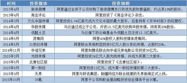 據(jù)悉,封面將主打新聞客戶端,以The cover.cn網(wǎng)站為基礎(chǔ),涵蓋微博 、微信、視頻、數(shù)據(jù)、論壇、智庫等,并逐步推出多個垂直細(xì)分領(lǐng)域的產(chǎn)品矩陣。未經(jīng)證明的傳說傳聞稱,這次阿里為了打造封面?zhèn)髅,不惜?億巨資。 四川日報作為傳統(tǒng)媒體,此刻搭上了資本的順風(fēng)車,搖身一變成為新媒體,無疑再次令不少傳統(tǒng)媒體同行艷羨不已。而阿里作為傳媒領(lǐng)域的投資老手,近兩年通過不同的資本運(yùn)作方式,已控制了海內(nèi)多家媒體的話語權(quán)。 那么題目來了,阿里如斯瘋狂擴(kuò)張傳媒版圖背后的邏輯到底是什么呢? 投資觸角不斷延伸,阿里瘋狂擴(kuò)張傳媒版圖 從過往歷史中不難發(fā)現(xiàn),阿里此前也曾多次進(jìn)行過傳媒領(lǐng)域的投資。其中,影響力最大、最深遠(yuǎn)確當(dāng)屬阿里對第一財經(jīng)的投資。 四個月前,阿里以24億元巨額投資第一財經(jīng)的動靜瞬間引爆整個互聯(lián)網(wǎng)圈,所引起的轟動好像仍在面前。 當(dāng)時,第一財經(jīng)頂著中國唯逐一家集廣播、電視、日報、網(wǎng)站、雜志于一體的中國專業(yè)財經(jīng)媒體的光環(huán),而且其平面媒體包括海內(nèi)著名度頗高的財經(jīng)類報紙《第一財經(jīng)日報》和財經(jīng)類雜志《第一財經(jīng)周刊》,阿里的想法主意是憑借自身的資本和渠道,以及一財?shù)挠绊懥,將后者打造?ldquo;中國版彭博社”。 但阿里的野心不止步于此,實際上,自2013年開始,阿里在傳媒領(lǐng)域的投資動作就從未中斷,且投資觸角已陸續(xù)伸向傳統(tǒng)平面媒體、影視公司及新媒體。