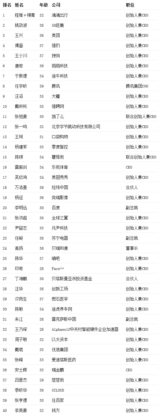 北京時(shí)間11月2日晚間動(dòng)靜,《財(cái)富》(中文版)本日正式宣布2015年"中國40位40歲以下的商界精英"榜單。 其中滴滴出行CEO程維、總裁柳青并列榜首,58同城創(chuàng)始人兼CEO姚勁波和美團(tuán)創(chuàng)始人兼CEO王興分列第二、三。 2015年榜單中,滴滴快的CEO程維(32歲)、總裁柳青(37歲)首次登頂,在《財(cái)富》雜志收拾整頓的"獨(dú)角獸"(即估值10億美元以上的未上市公司)輿圖上,滴滴快的占據(jù)了很顯眼的位置;14年創(chuàng)辦3家公司的連續(xù)創(chuàng)業(yè)者,58趕集創(chuàng)始人兼CEO姚勁波(38歲)位列亞軍;美團(tuán)創(chuàng)始人兼CEO王興(36歲)進(jìn)入榜單前三甲;獵豹?jiǎng)?chuàng)始人兼CEO傅盛(37歲)、搜狗創(chuàng)始人CEO王小川(37歲)分別位列第四、五名。 今年榜單新上榜者超過20位。一些新興行業(yè)逐漸受到創(chuàng)業(yè)者關(guān)注,包括創(chuàng)立短租平臺的住百家創(chuàng)始人兼CEO張亨德(30歲)、出產(chǎn)無人機(jī)的深圳市大疆立異科技有限公司創(chuàng)始人兼CEO汪滔(35歲)等。 多位新上榜的年青企業(yè)家以技術(shù)等核心上風(fēng),在各自的領(lǐng)域嶄露頭角。今年30歲及30歲以下的上榜者達(dá)7位,其中最年青的是中關(guān)村智能硬件企業(yè)加速器的創(chuàng)始人兼CEO王乃琛,年僅26歲。 今年是《財(cái)富》(中文版)第五次發(fā)布"中國40位40歲以下的商界精英"榜單。該排行榜在中國推出之時(shí),榜單就已確立了明確的尺度:(1)截止3月份之前,春秋必需小于40歲(不包括40歲);(2)上榜者所從事的事業(yè)具有巨大的貿(mào)易遠(yuǎn)景,有改變行業(yè)格式的潛力;(3)是要求所有上榜者的事業(yè)不能繼續(xù)自家族,而是必需由他們自己創(chuàng)辦。(無雙) 以下為完整榜單: ![]() |