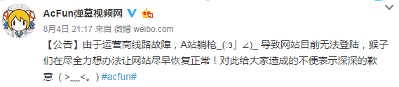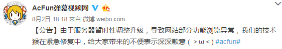 A站2016年8月2日就在官方微博上表示,因?yàn)锳站服務(wù)器暫時(shí)性調(diào)整進(jìn)級,導(dǎo)致網(wǎng)站部門功能瀏覽異常,A站的技術(shù)職員在緊急修復(fù)中,給大家?guī)淼牟槐惚硎旧钌钋敢狻?/p>
