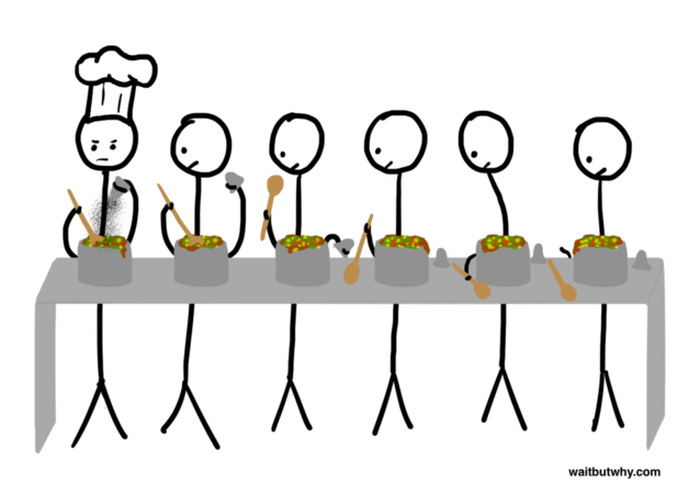 從馬斯克身上,我們看到一個極具天賦、愿景和超人膽量的人。但我們會不由自主地假定,所有的這些特征多多少少是與生俱來的。所以對我們來說,譜系看起來更像下面這樣: 在我們的心中,我們都是獨立思索的大廚——只不外馬斯克真的是一個令人印象深刻的大廚。 這種看法,既高估了馬斯克,也高估了我們自己。真相完全不是這樣的。 當(dāng)然,馬斯克確實是一個令人印象深刻的大廚,但是,他之所以極端杰出,并不是由于他令人印象深刻,而是由于,我們中的絕大多數(shù)人根本不是大廚。 這就似乎一堆打字機望著一臺計算機說:「哥們兒,那真是一臺天才的打印機! 我們之所以難以瞥見事實真相,是由于我們沒把大腦中的軟件當(dāng)回事。我們不把大腦看做計算機,所以我們根本沒有意識到硬件和軟件的區(qū)別。當(dāng)我們想到大腦時,我們只留意到了硬件——那些與生俱來、難以改變或晉升的東西。而我們的推理過程則更無形。我們把推理看做一件天然而然發(fā)生的事,就像體內(nèi)的血流一樣——它是自動發(fā)生的過程,對它沒什么好說的,也沒什么好做的。 假如我們看不到硬件和軟件的區(qū)別,我們當(dāng)然就看不到大廚級別軟件和廚子級別軟件之間的差異。 理解我們與生俱來的邏輯思維「軟件」是一項重要的人生技能,它能被學(xué)到、訓(xùn)練和晉升,同時也是一個將成大事者和普通人區(qū)分開的主要因素。而忽略了我們邏輯思維「軟件」的本質(zhì),我們將留意不到人生游戲展開的舞臺。假如我們沒有意識到,推理是一個可以被創(chuàng)造或復(fù)制的東西——將導(dǎo)致我們將自己廚子般的行為誤以為獨立推理,然后,我們將大廚們真正的獨立思索誤以為超乎平常的魔法能力。 三個例子: 1)我們把大廚們對現(xiàn)在的清楚熟悉誤以為是對未來的愿景馬斯克的妹妹Tosca說「馬斯克已經(jīng)去過了未來,然后歸來告訴我們他在未來發(fā)現(xiàn)了什么!惯@是很多人對馬斯克的感覺——他擁有極佳的愿景,能看到我們看不到的東西。好比說,我們看到的東西是下面這樣: