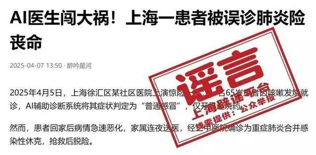 近日 有讀者向上海辟謠平臺(tái)詢問 網(wǎng)傳“AI醫(yī)生闖大禍! 上海一患者被誤診肺炎險(xiǎn)喪命”的消息 是不是真的?關(guān)于“上;颊弑籄I誤診喪命獲賠127萬(wàn)”的消息在社交平臺(tái)和部分自媒體上傳播,
