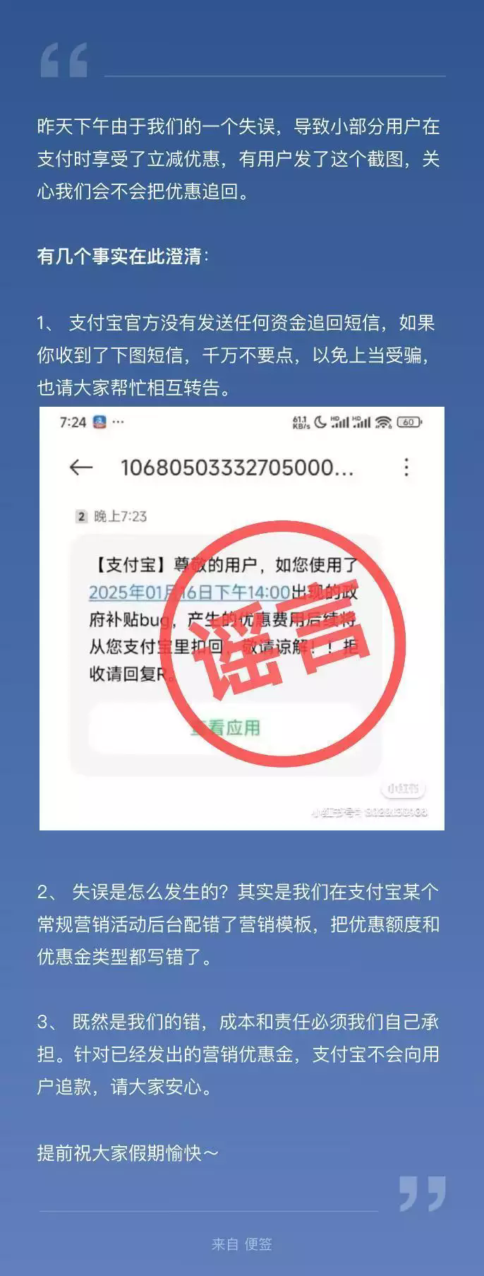 2025 年 1 月 17 日凌晨,支付寶官方微博發(fā)文回應(yīng)誤發(fā) “立減優(yōu)惠” 事件。以下是回應(yīng)的具體內(nèi)容: 事件原因: