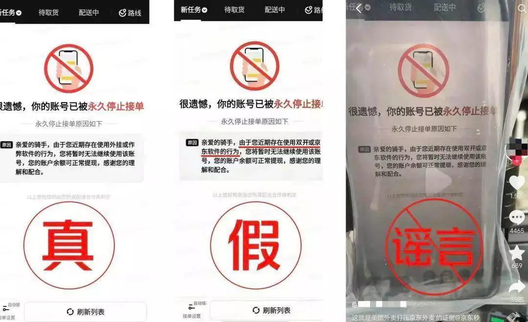 美團(tuán)4月27日在其官方公眾號“小團(tuán)有話說”發(fā)布聲明稱,在澄清“去其他平臺跑單會被美團(tuán)永久封號”的謠言后,社交平臺上依舊出現(xiàn)了騎手App顯示“永久停止接單原因為:存在使用雙開或京東軟件的行為”的謠言圖片。