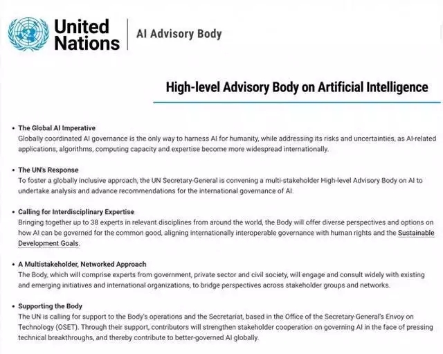 聯(lián)合國(guó)成立39人咨詢顧問(wèn)團(tuán)隊(duì)以解決人工智能國(guó)際治理問(wèn)題。 聯(lián)合國(guó)成立了一個(gè)由39人組成的咨詢顧問(wèn)團(tuán)隊(duì),以解決人工智能國(guó)際治理問(wèn)題。該團(tuán)隊(duì)由來(lái)自世界各地的專家組成,