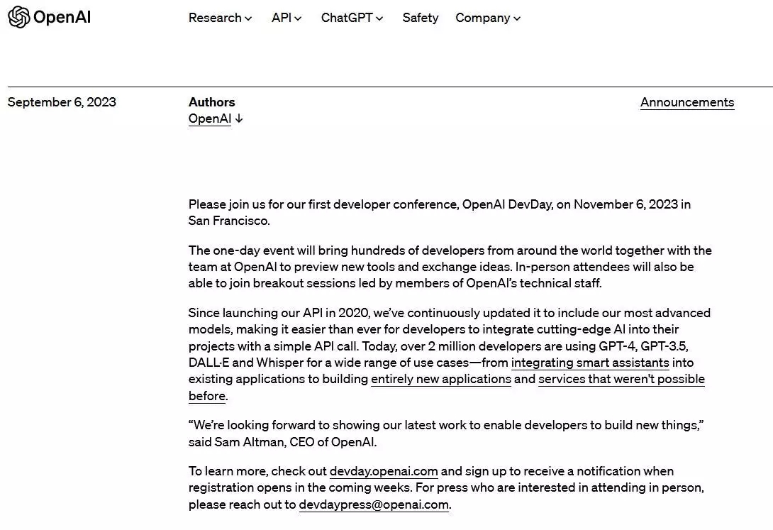 9月7日電 當?shù)貢r間6日,美國人工智能公司OpenAI在官網發(fā)布公告稱,將于11月6日在舊金山舉辦公司的首屆開發(fā)者大會。 公告介紹,