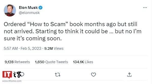 馬斯克發(fā)今日推文稱:“在幾個月前訂購了一本叫做《怎么欺詐》的書,但還沒到,開始覺得它可能是... 不,我相信它很快就會到了!